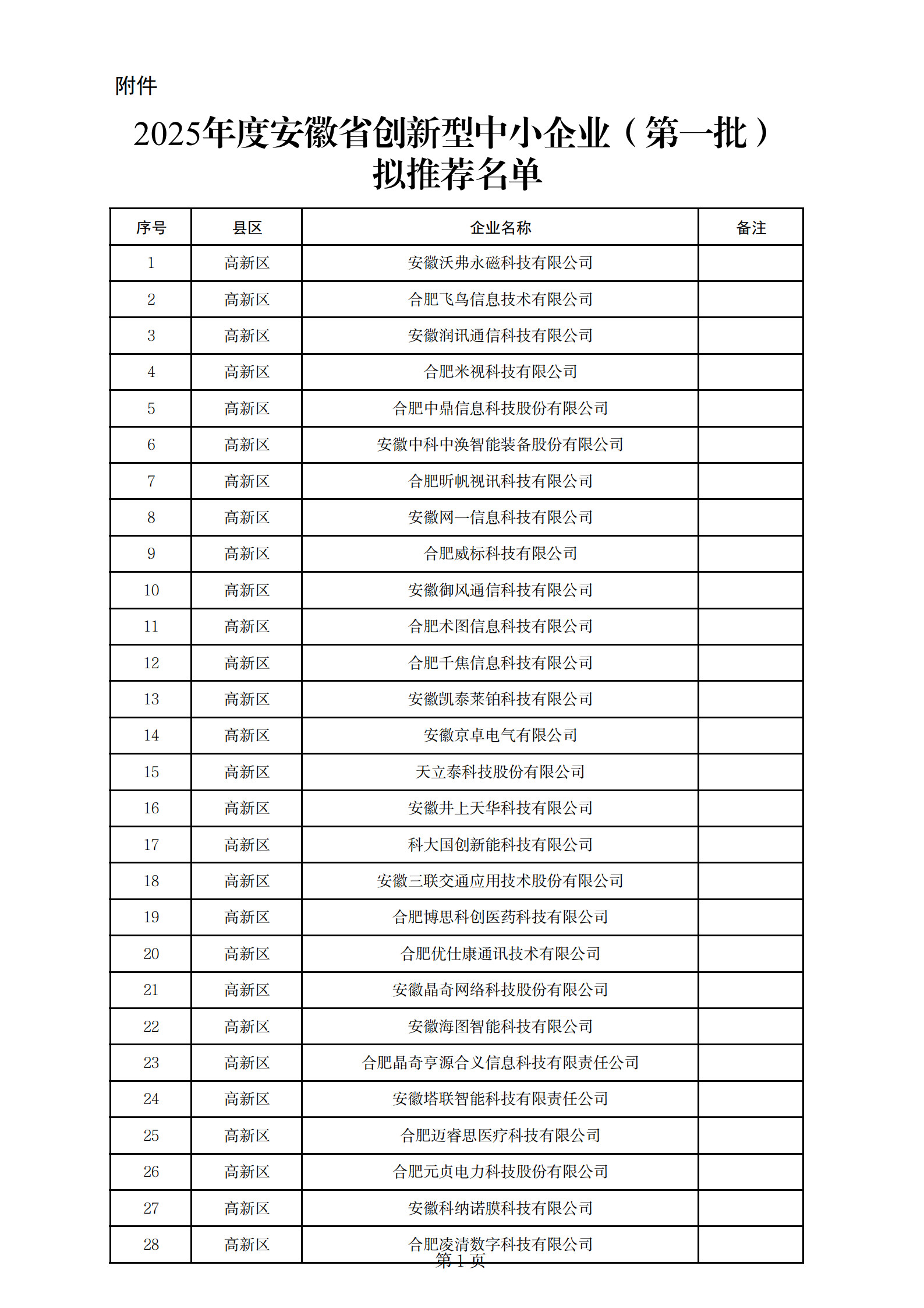 附件:2025年度安徽省创新型中小企业(第一批)拟推荐名单