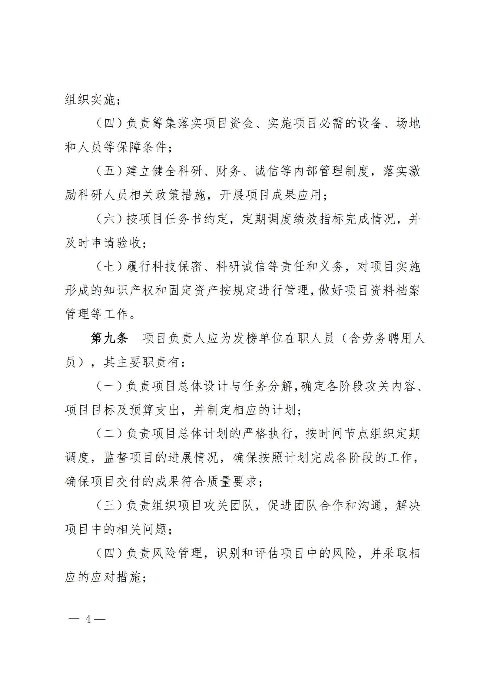 (四)对项目负责人要求。项目负责人应为发榜单位在职人员(含劳务聘用人员),且为实际负责该项目研究的人员,如非在职人员,须由单位出具正式聘用合同,聘用时间须覆盖项目实施周期。年龄超过57周岁的(院士超过70周岁,按申报截止日计算),须由单位出具其能完成项目实施的承诺函(如返聘、延迟退休等)。立项后项目负责人原则上不能更改,确须更改的由发榜方逐级报批。