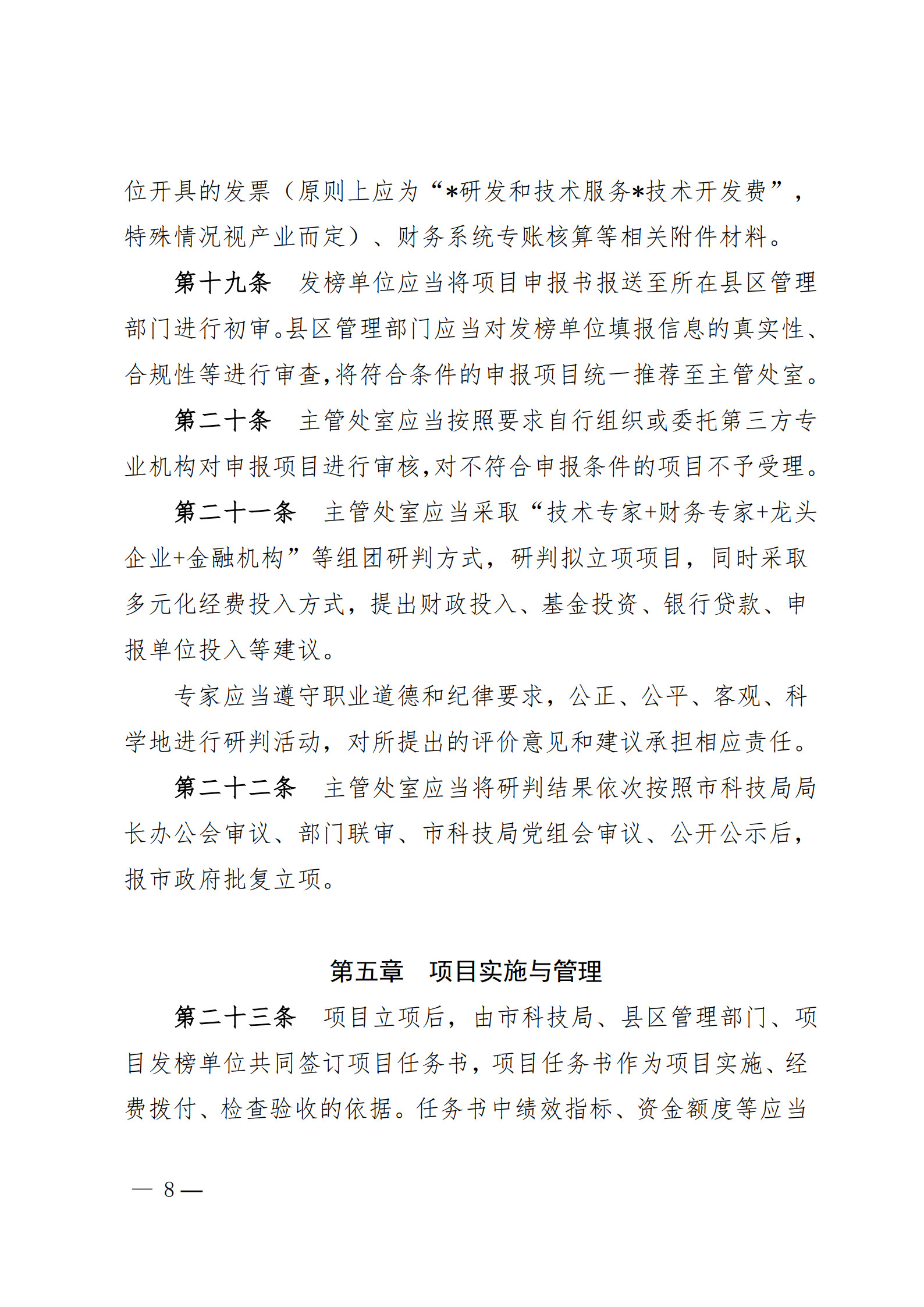 (五)对项目评审立项要求。市科技局对通过形式审查项目采取“技术专家+财务专家+龙头企业+金融机构”等组团研判方式研判拟立项项目(研判一般包括会议答辩与实地考察),研判结果依次按照市科技局局长办公会审议、部门联审、市科技局党组会审议、公开公示后,报市政府批复立项。