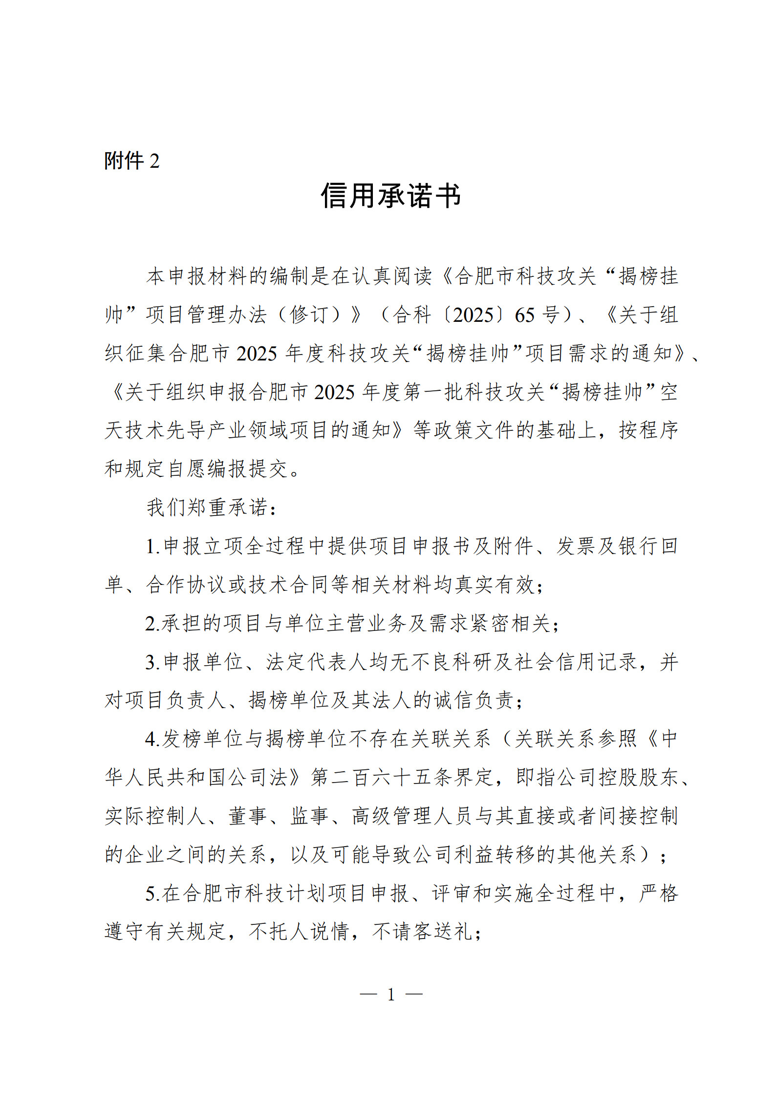 (一)2025年合肥市科技重大专项“揭榜挂帅”项目申报书或2025年合肥市关键技术研发“揭榜挂帅”项目申报书。